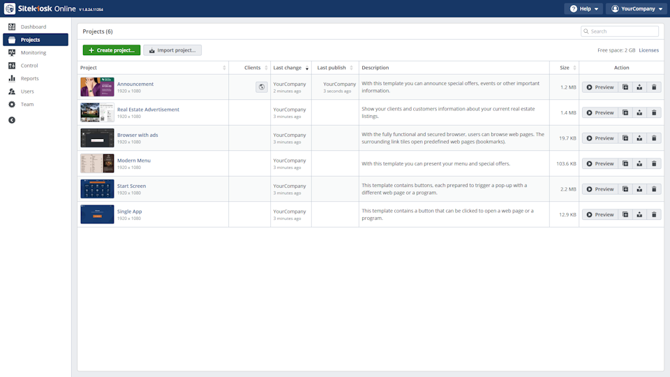 In the Projects section you can create new projects, manage and edit existing projects and publish them on your clients.